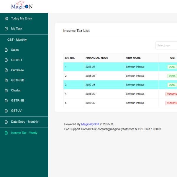Managing GST filings and financial records can be overwhelming, but Magicon CRM makes it effortless! Designed specifically for tax consultants, accountants, and CA firms, it helps you **track GST compliance, manage financial data, manage income tax and automate tasks—**all in one powerful platform.
